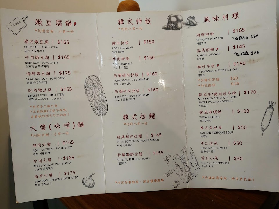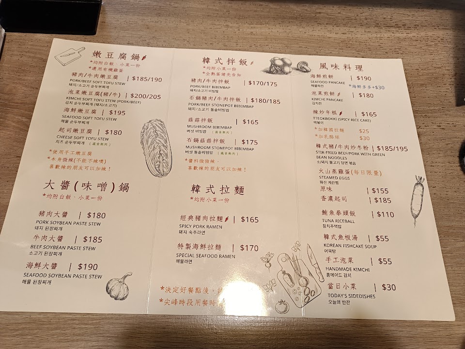 我6:30進去知道無法訂位,店家也告知要等!但不知道要等多久⋯想說就等吧!先在入口處等後,1個半小時後好不容易就坐與他人併桌,又開始陷入無止境的等餐點上來,終於在8:30吃到食物!小菜只有兩樣而且沒有紅紅的泡菜,店內剛開幕明顯人手不足,無法接應那麼多客人,食物我覺得吃起來普通,份量稍少!可能要等熱潮過後來吃比較不會等到癲掉?創業不容易在頭份也難得有年輕韓國人開的料理 加油喔!