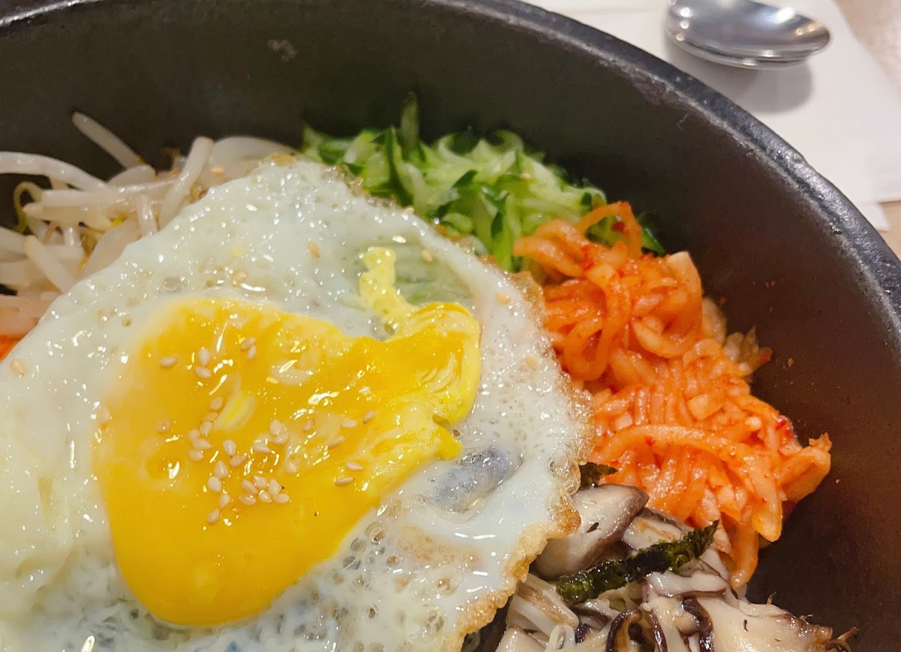 不久後,服務員端來了我們的石鍋拌飯。它放在一個滋滋作響的石鍋裡,散發出誘人的熱氣。這碗拌飯上面擺滿了各種精心準備的配料,包括煎蛋、烤海苔、酸菜、炒豆芽菜和烤牛肉,色彩繽紛,令人垂涎欲滴。