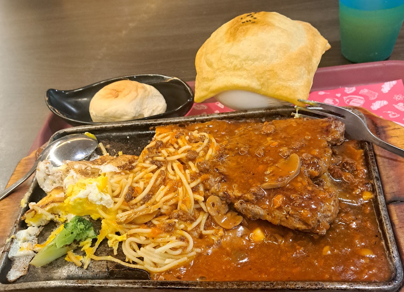 總之,我氣到整份餐點如照片那樣,動也不動的放在一旁,再去點隔壁的重組牛排填飽肚子了⋯⋯