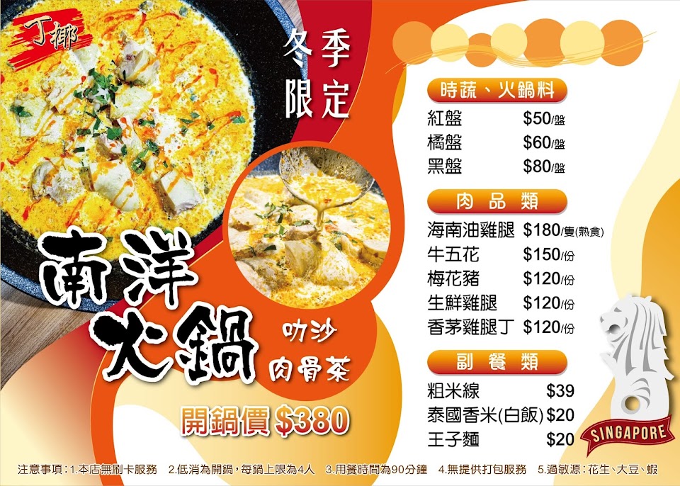 目前以叻沙火鍋為主題,單人可以點叻沙面和小點心 餐點:4 服務:5 氣氛:5