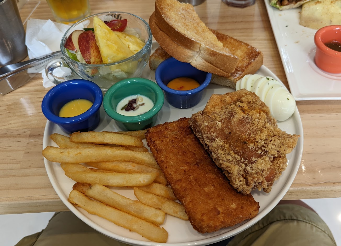 選擇超級多,點了兩個套餐,炸雞不錯吃,厚片真的很厚,目前缺蛋,所以蛋改地瓜,生意很好,內用拿菜單自行入座,翻桌率高,不過室內比較悶,空氣不夠流通的感覺,洗手間只有一間男女共用,還算乾凈,目前只提供現金支付