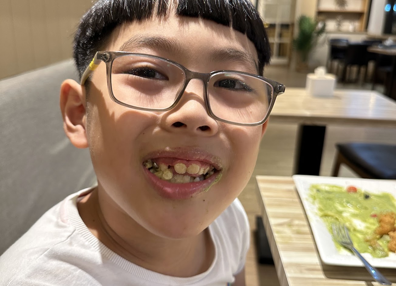 好吃到忘了拍照,只好拍小屁孩的滿意照