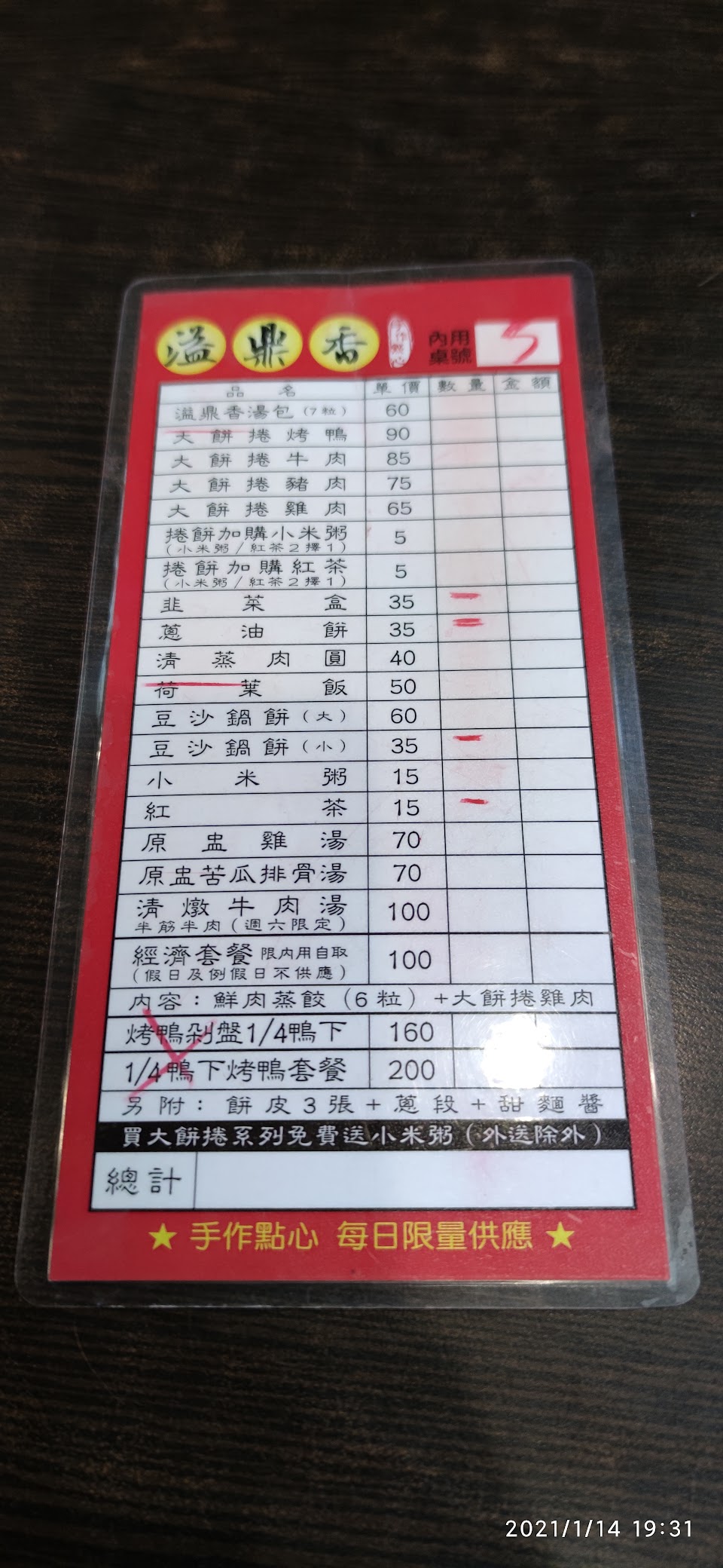捲餅非常好吃!香氣十足,捲餅餅皮酥脆,內餡軟嫩,搭配甜麵醬及小黃瓜,十足展現鹹甜及清脆的口感,非常推!小龍湯包湯汁多,可惜內餡有點柴,並且現蒸,需要等較久的時間,雖然有這樣的小缺點,不過整體感覺起來值得給五顆星!