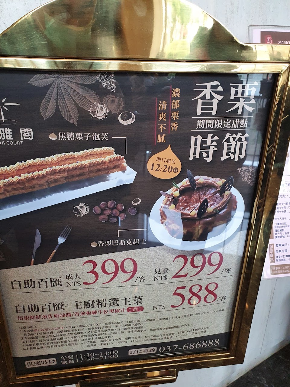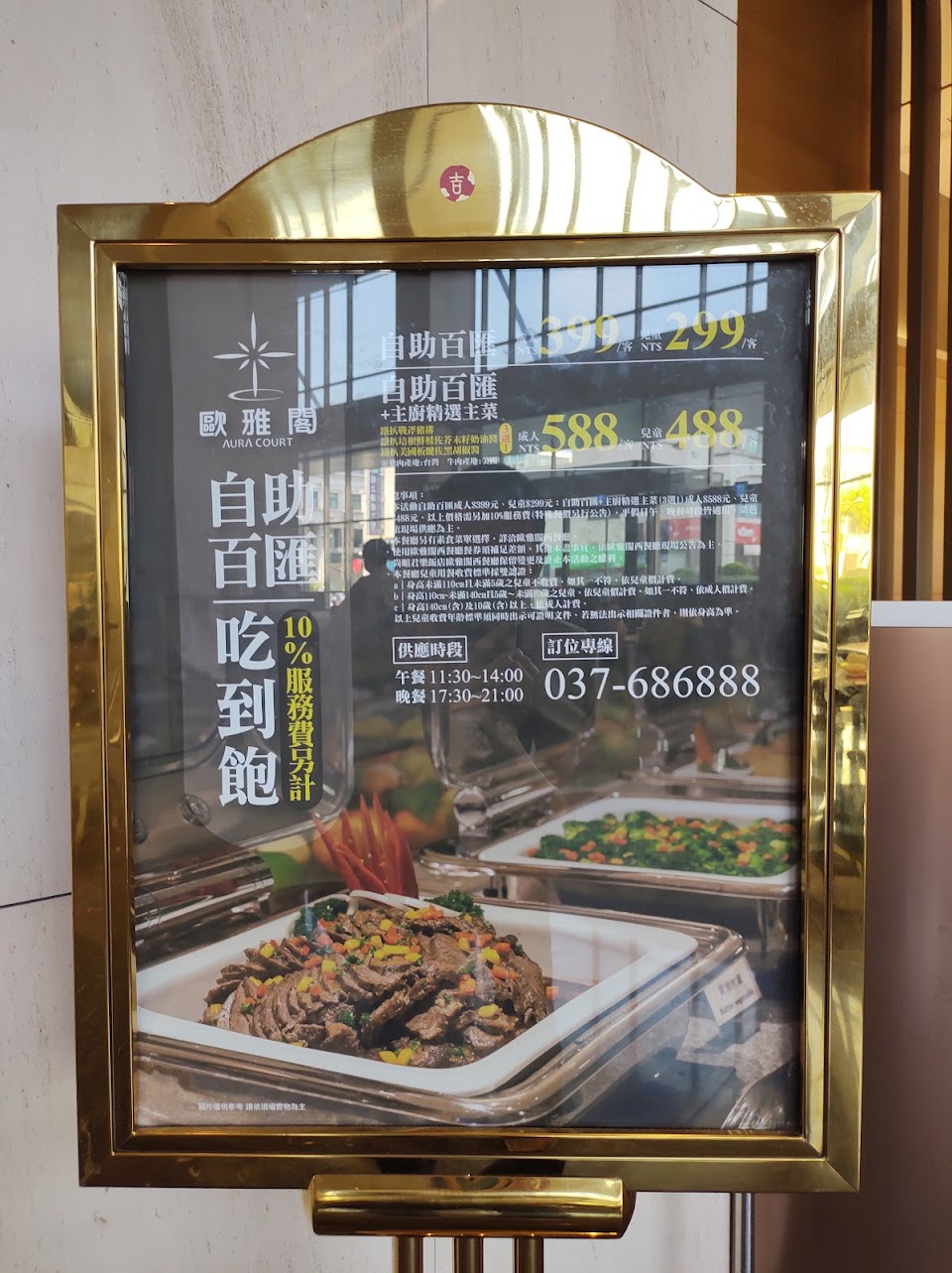 位在尚順君悅飯店一樓,交通與購物都方便。菜色不含飲料點心約30道,跟新竹同業相比數量略少,不過大都有水準以上(匈牙利燉牛肉真的不錯)。以頭份這地點來說,399+10%還算公道。