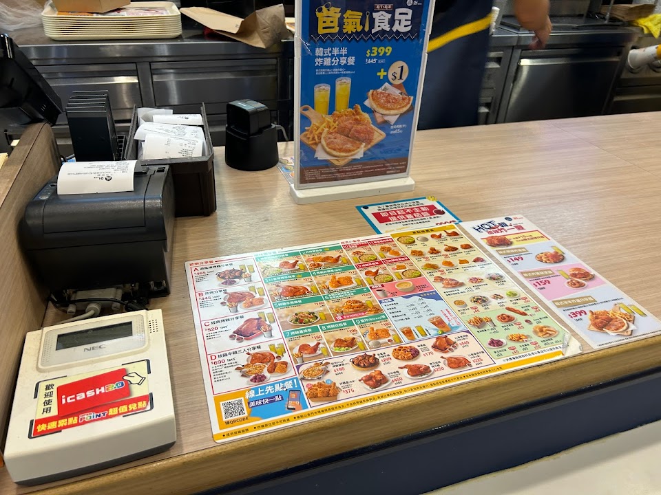 內用炊粉和烤雞、紫薯地瓜球,味道不錯但份量略少;外帶一份黃金脆薯和地瓜球,等待了約五分鐘,薯條是冷的軟的;完全就是放了20分鐘沒賣出去的薯條,有點被騙的感覺,家人說乾脆丟掉了。