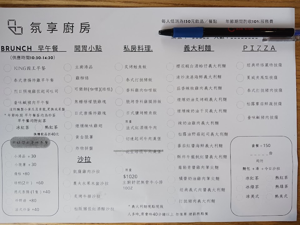 原本要去艾蜜奇用餐,但因要等1小時,只好跟同學3個人在下午約2點半來到氛享廚房,可能太餓了,餐點的部分覺得不難吃,但是加價點的西西里咖啡沒有檸檬片,服務生對於我們的疑惑,也沒回應就走了,後來客人都陸續離開了,只剩我們這一桌,我們都用完餐了,也沒過來詢問是否上飲料?還要我主動到吧台提醒,不知道10%服務費是在收什麼意思的?而且服務生可能太閒了,竟然就在吧台打起毛線了,真是傻眼,但最讓人生氣的是,我們畢竟是兩點半才進來用餐,用餐沒多久就覺得冷氣不涼,整個餐廳陷入悶熱的狀態,結帳離開時,我忍不住問服務生,請問你們的冷氣是有限時嗎?他竟然回答「因為剛剛有客人反應太冷,所以把冷氣關小了」,真是可笑的回答, 根本是用關冷氣的方式逼客人離開啊,而且餐點的費用不低也收服務費,竟然還怕客人吹冷氣,你要我們離開可以過來告訴我用餐時間到了,但不要用這種關冷氣的方式,真的很沒水準
