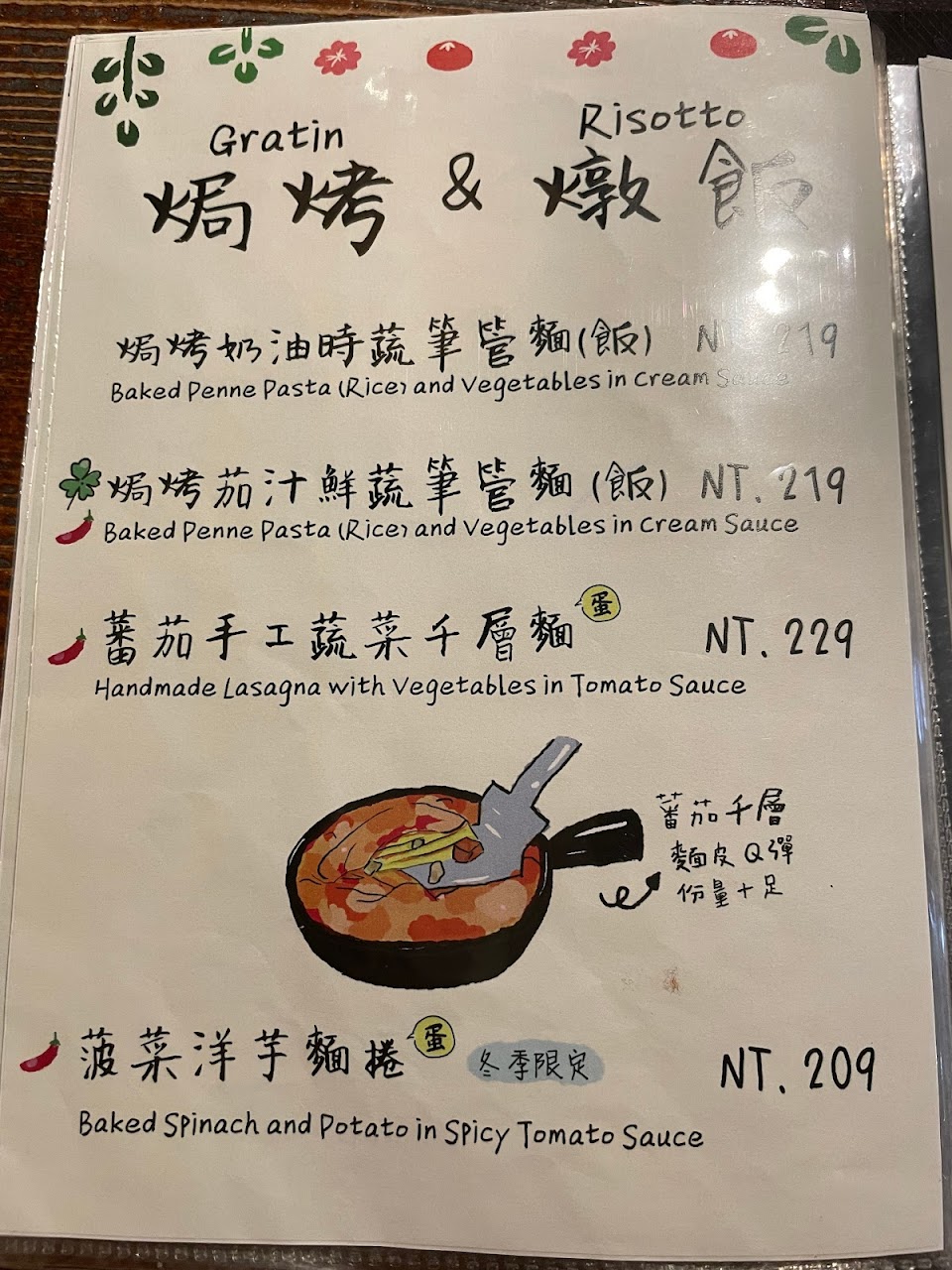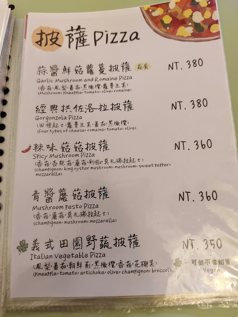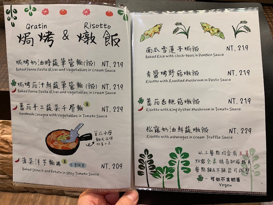 青醬野菇燉飯, 義式烤飯糰, 山野蔬食pizza, 腐皮捲