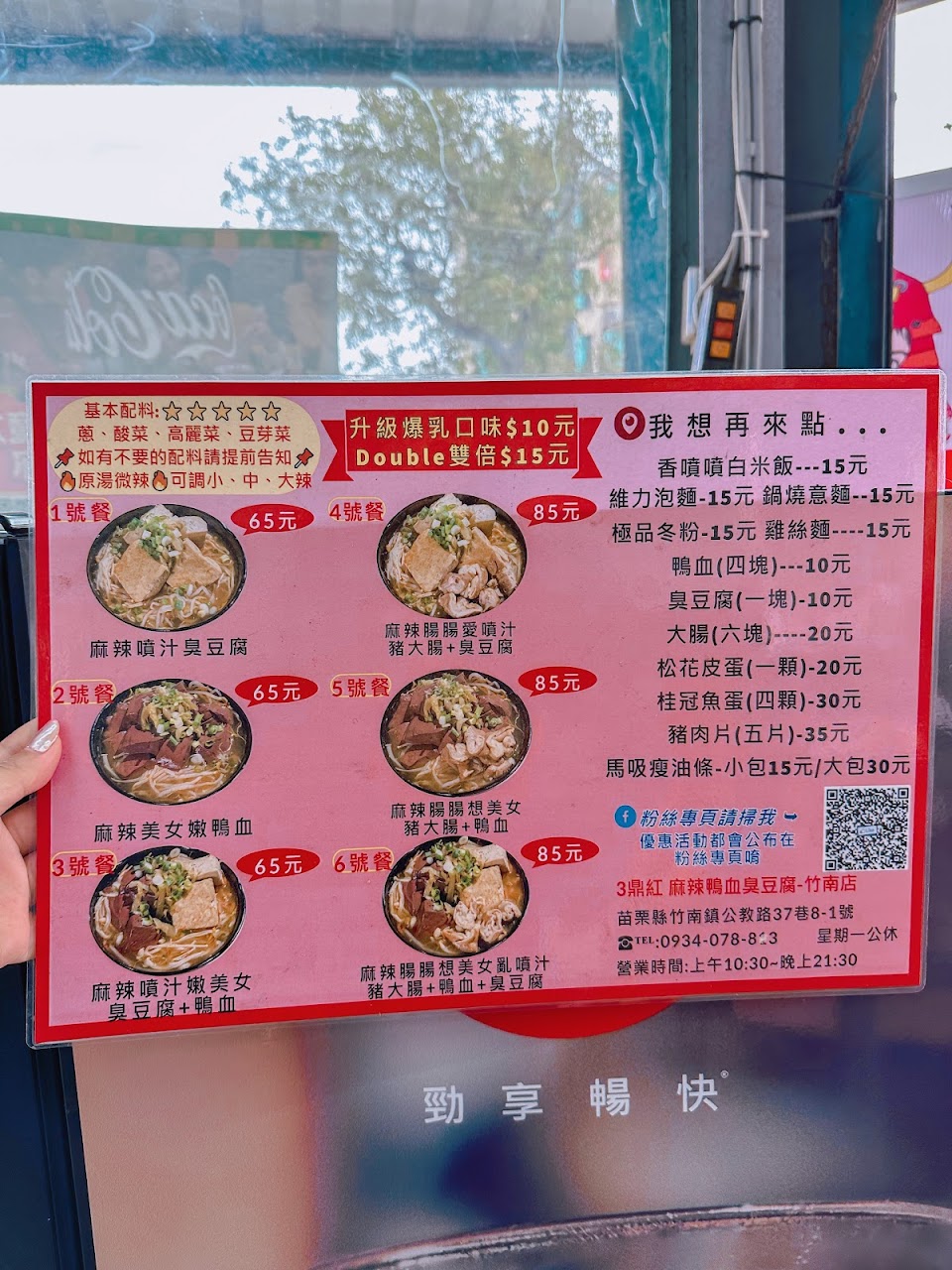 台中的3鼎紅麻辣鴨血臭豆腐,在苗栗竹南也有開分店哦!讓我在苗栗工作也能品嚐到(ʃƪ^3^)我還蠻喜歡吃麻辣鴨血、臭豆腐~不管走到哪裡,只要看到有賣麻辣鴨血、臭豆腐的店,我會二話不說直接走進去狠狠給它吃一波(⌯꒪͒ ꌂ̇ ꒪͒)老闆娘說:她店裡賣最好的是⓹號餐和⓺號餐,所以我們點了一個⓹號餐跟一個⓺號餐!想吃吃看到底差在哪?另外3鼎紅的餐點取名方式還蠻有趣~相信絕對不會跟其他家的餐點名稱撞名(ᗒᗜᗕ)՛̵̖