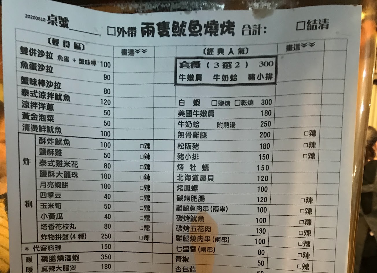 東西整體都非常好吃,雖然現烤的每樣東西都等滿久的。 1.魚蛋沙拉-好吃不會很乾 2.鹽酥雞-非常好吃肉質很嫩,後來還多點一次 3.四季豆-好吃還有加蒜片不會很油 4.套餐3選2(牛奶蛤(5顆)、牛嫩煎)-都很,新鮮好吃,牛肉也很嫩。 5.烤牡蠣-有七顆也很鮮甜好吃 6.烤鳳螺-表現普通 7.雞腿蔥肉串-雞肉跟鹹酥雞是一樣的肉,但吃起來普通 8.炭烤魷魚-肉質軟,但烤起來沒什麼味道 9.青椒-表現一般 10.杏鮑菇-非常好吃唷 11.一夜干(日本鯖魚)-非常好吃,刺很少 12.清蒸文蛤-很鮮甜還有湯可以喝。 13.鯊魚煙-點了很多道菜,這道最難吃了,沒退冰完全,也不好吃。 14.北海道扇貝(3顆)-好吃。