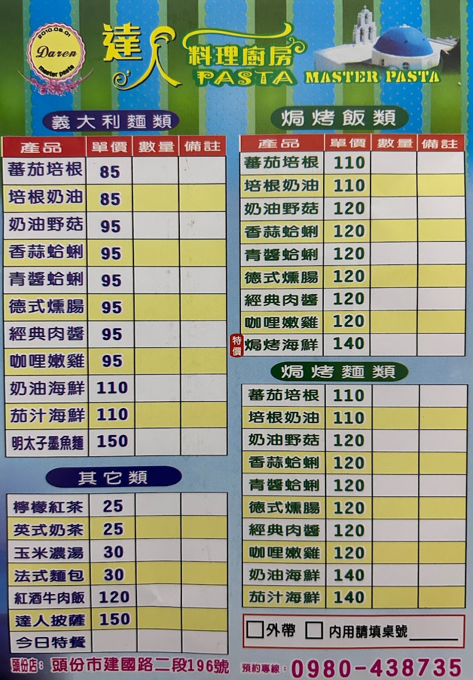 2024最新在地推薦餐廳的菜單_達人料理廚房PASTA 中正店的菜單、圖片