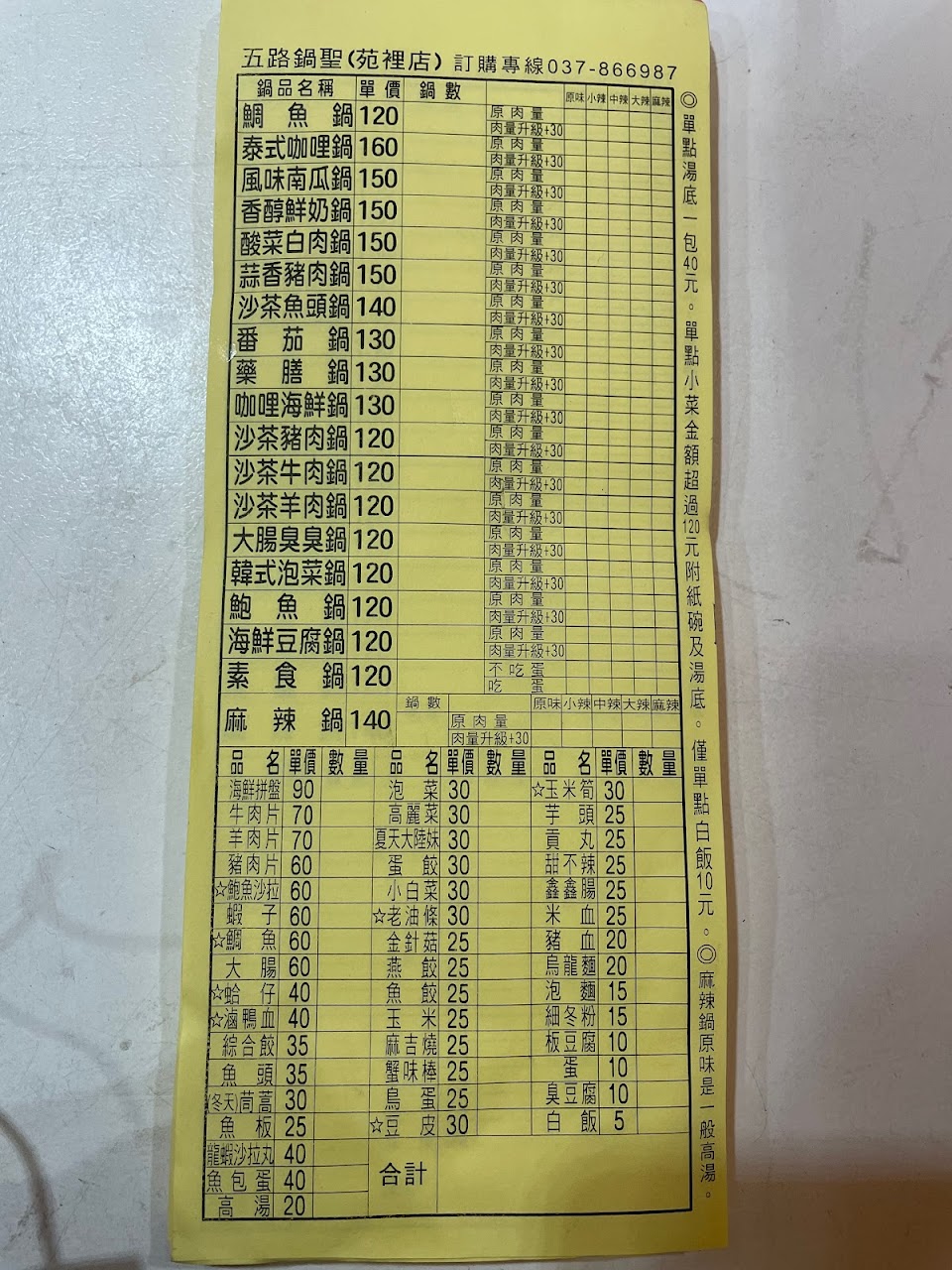2024最新在地推薦餐廳的菜單_五路鍋聖苑裡店的菜單、圖片
