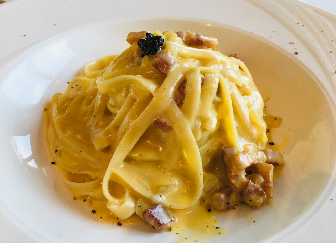 培根蛋黃義大利麵:醬汁濃郁香醇。