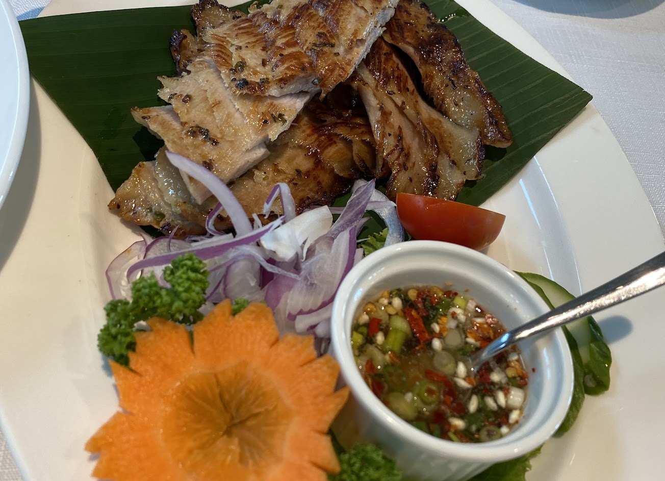4月到9月是泰式料理,非常泰式有點辣,涼拌海鮮沙拉,燒烤伊比利豬,龍蝦粉絲煲,月亮蝦餅,泰北椒麻雞,泰國米香飯,非常可口下飯。