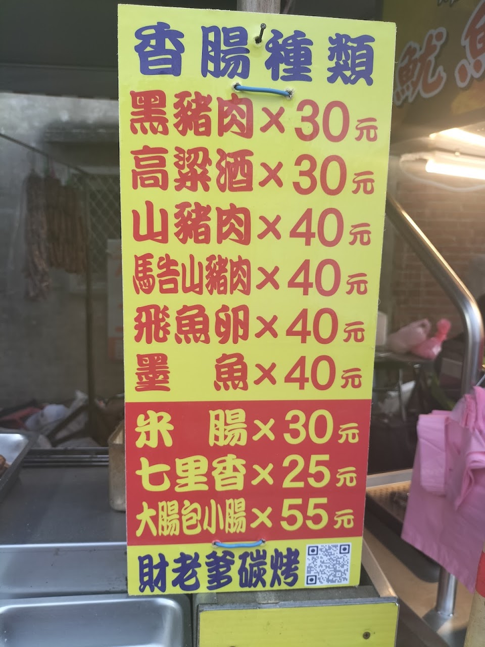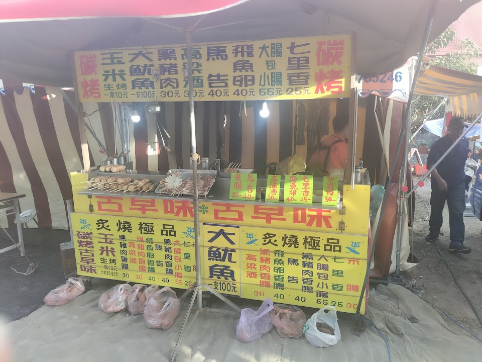 玉米、香腸、糯米腸、魷魚….等美食,都是炭火現烤古早味,香料調製而成的獨家醬料?