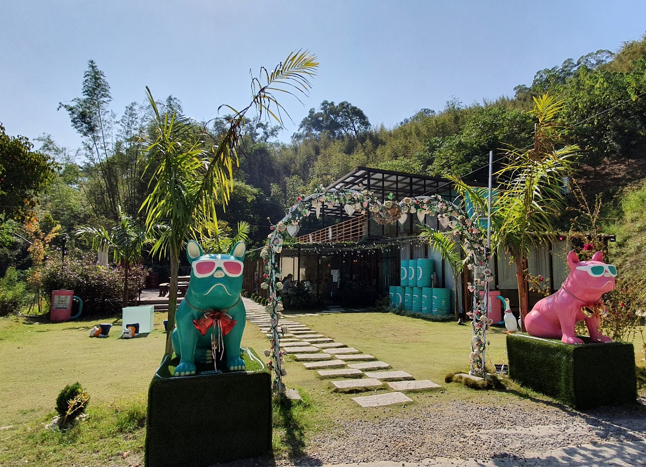 沿路都有路標,但是要注意路標上的方向,不然會超難會車,路就一台車寬剛好。雖說景觀,但是景觀沒有到很吸引人,但是深山中的幽靜自有一番特色。是個友善寵物的咖啡廳,店狗非常可愛,店內有許多跟店狗相關的擺設。