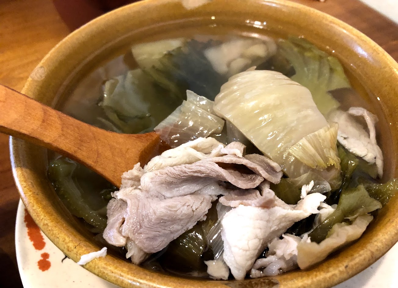 我們點了3C套餐,客家小炒好吃,高麗菜跟筍子算是中規中矩、有點偏油,薑絲大腸蠻酸的,梅干絞肉不怎麼好吃,用絞肉不香口感也不好,後來在老街買了梅干菜回家自己煮梅干扣肉好吃多了,梅干菜還是配三層肉比較搭。整體而言吃得很飽但是口味不如預期。