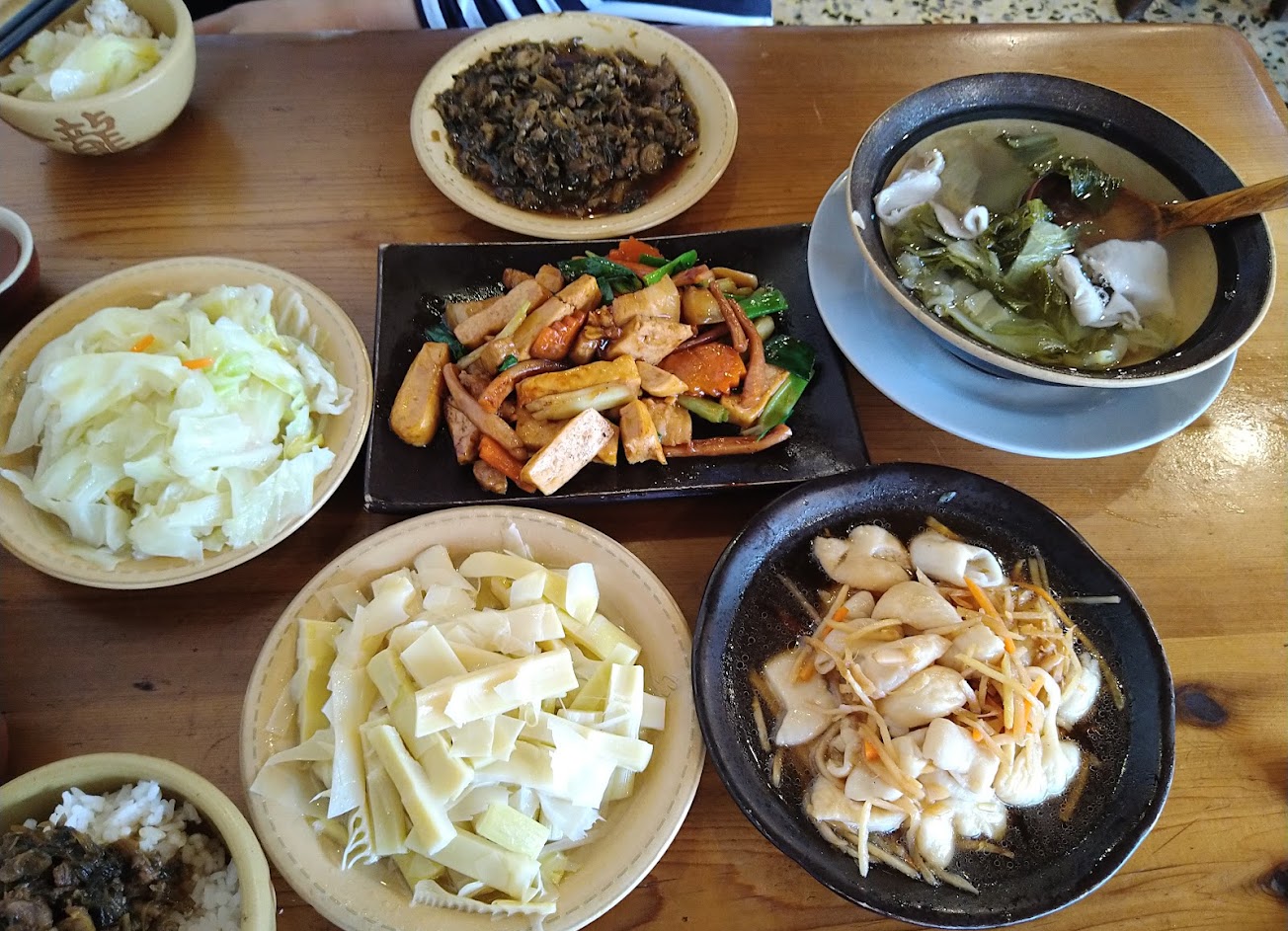 點了五福2B套餐(清蒸鱒魚、梅干絞肉、滷桂竹筍、高麗菜、酸菜肉片湯)600元外加客家小炒180元。 清蒸鱒魚肉質細嫩,但小刺有點多,要小心。梅干絞肉和滷桂竹筍非常好吃,很下飯。高麗菜吃起來不像炒的,味道倒很像用水煮的燙青菜。酸菜肉片湯味道道地,但肉片乾柴,口感不佳。加點的客家小炒也不像是現炒的,吃起來是溫的,快炒的鑊氣也沒有。 可能是網路評價太高(南庄餐廳之最),導致有期望過高。 客家菜本應重油重鹹,但老金龍在這部分有做改善,口味清淡也不油膩,這點是加分的。