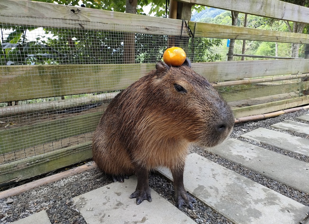 而且辛苦開上來後你會發現超~後~悔~ 因為園區真的很小 能看的動物只有笑笑羊、袋鼠跟水豚就沒了 鴨子跟烏龜到處都可以看啊~~ 而且水豚也只有3隻?? 遊客這麼多三隻真的不夠看餒 而且橘子都是爛掉的 放在水豚頭上他一定想說花惹發