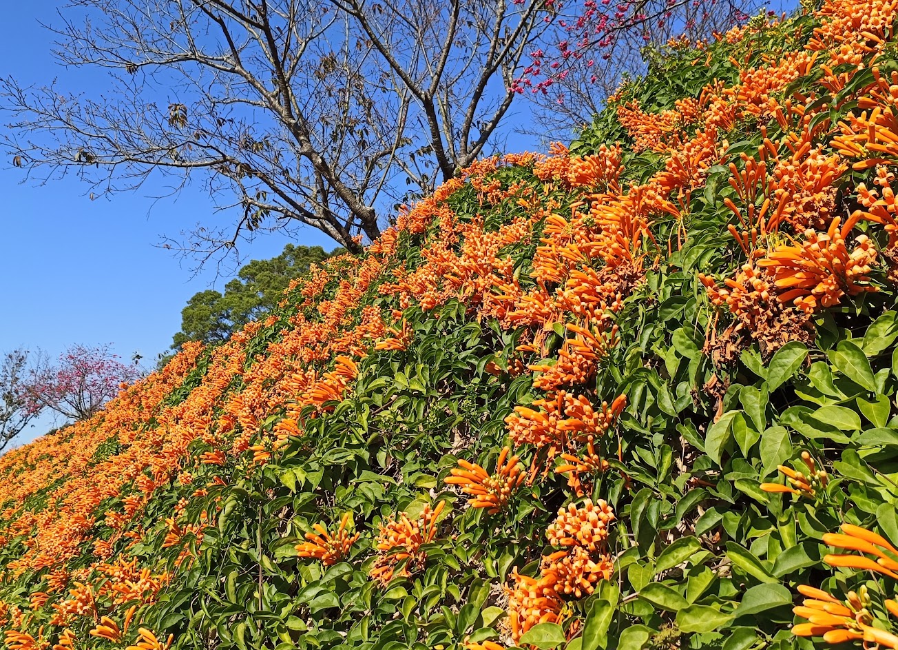 綿延的橘色炮仗花海相當漂亮,粉紅色櫻花樹更是畫龍點睛,非常值得一遊的賞花景點。