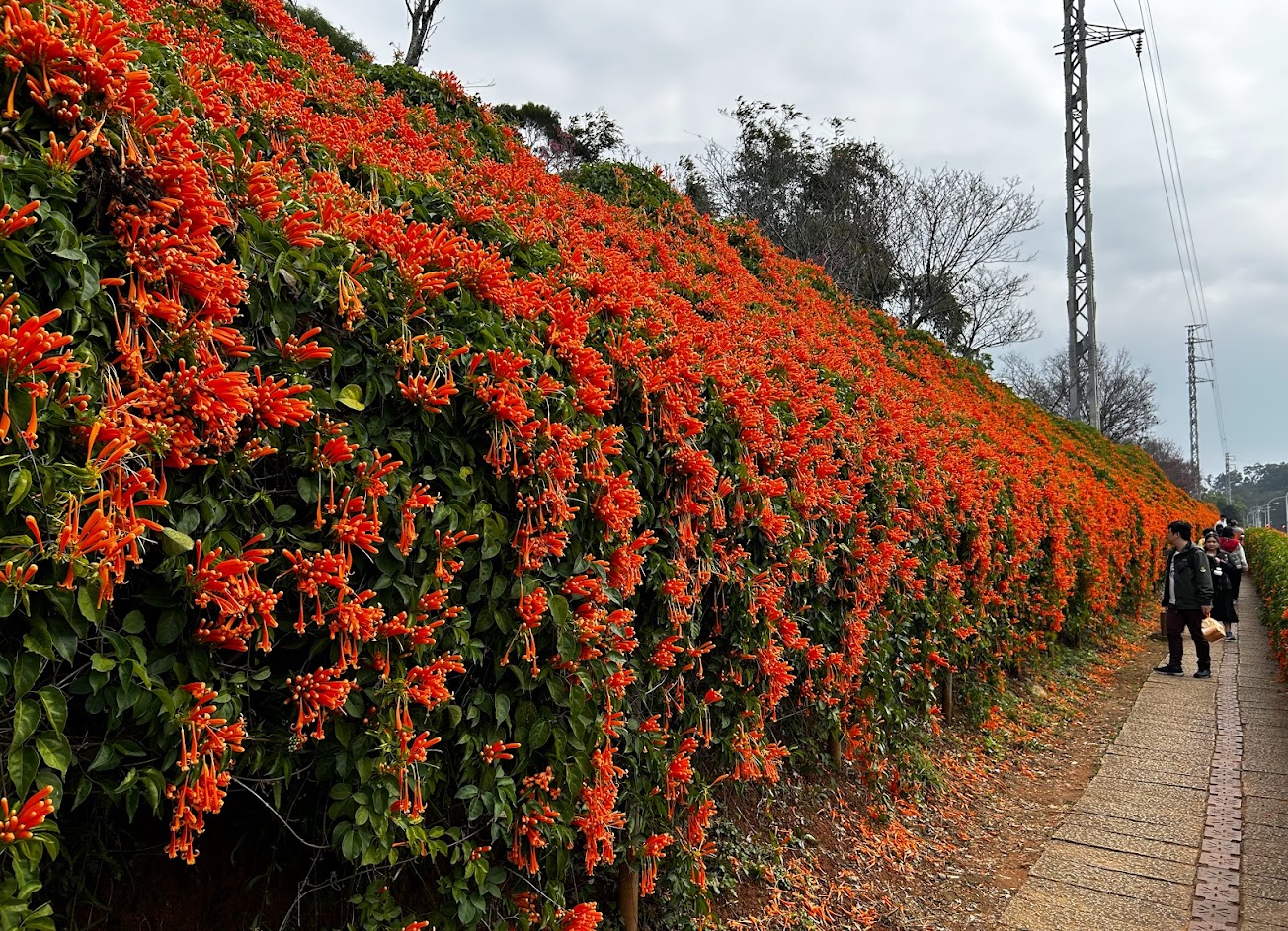 炮仗花海20240224 橘色鳥尾花佈滿整片走廊兩側和整排深紅色櫻花 可利用假期短暫停留拍照散步
