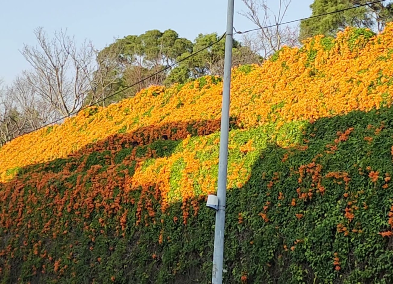 超棒的炮仗花,有二面花牆,季節對了開得都很好,靠路邊的花牆要小心汽車,上方公園可以遠眺客屬大橋等景點,不過假日停車不易。