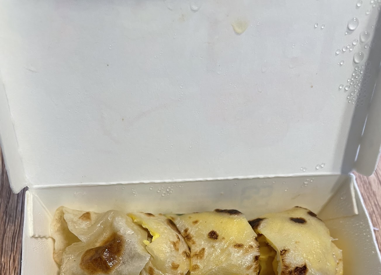 蘿蔔糕似乎是兩塊,其中一塊煎得比較焦,另一塊比較白,其中吃到有酸酸的味道,不敢繼續吃⋯蛋餅夾肉的餅皮味道不佳,像是有潮濕霉味,只好把餅皮挑掉,單吃肉,只有肉好吃