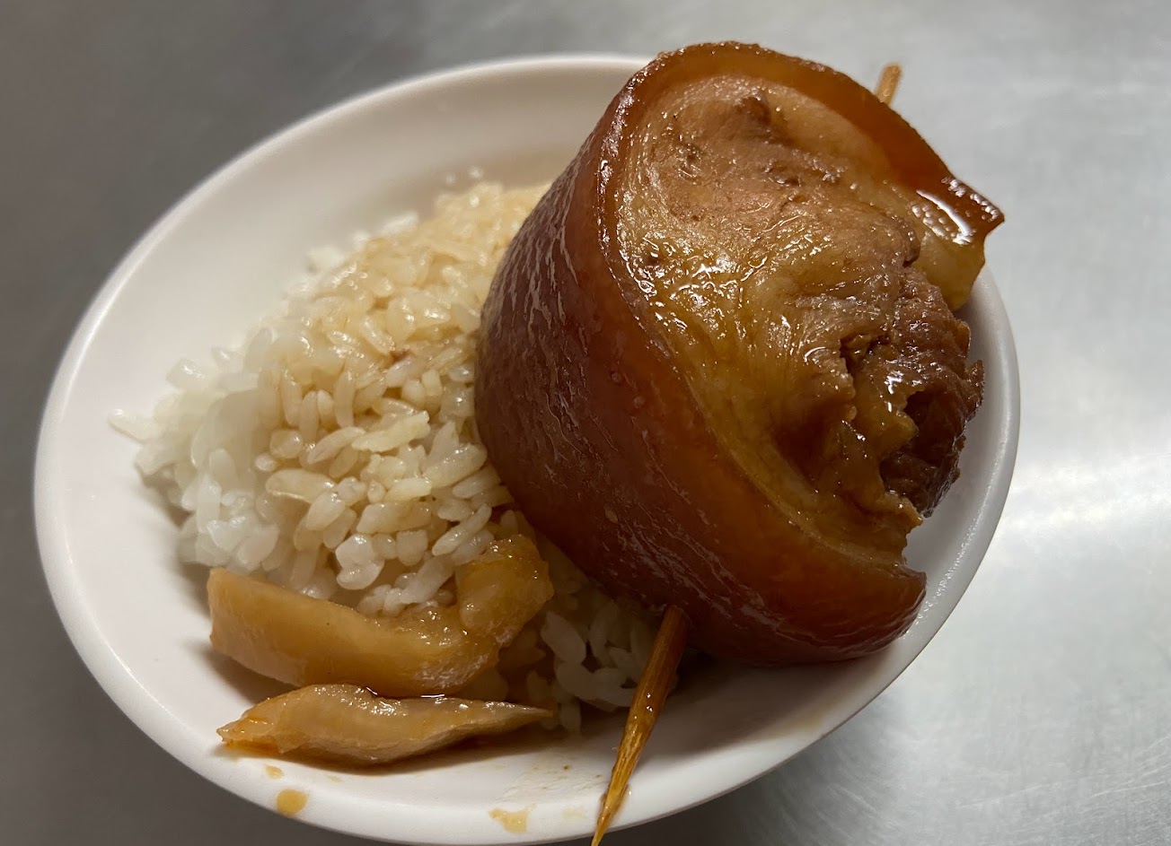 焢肉皮跟肥處理的恰到好處,不膩口感Q瘦肉部分比較有口感偏紮實,米飯感覺是剛煮好的粒粒分明,但非常的可惜沒有米飯的澱粉粘著感,如果有伴著肉汁肯定非常的好吃,可能是米飯煮好沒有時間悶夠急著盛碗吧!魯蛋偏鹹