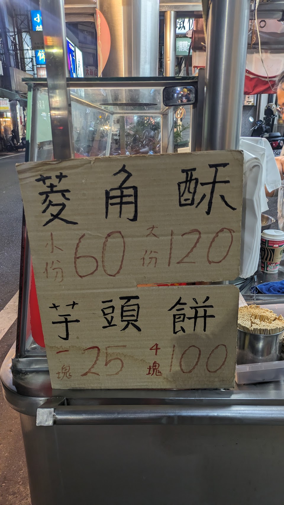 第一次吃炸菱角酥,吃起來炸皮有點麵包香,加上內裡的菱角,真的會一顆一顆吃得很順口也不會油膩。芋仔餅也好吃,皮非常酥脆又不油,但一個芋仔餅要25元小小的且餡料也薄薄的,基本上吃兩、三口就沒了。菱角酥小份60元、大份120元,也不是太便宜。但味道不錯,想吃時可買。
