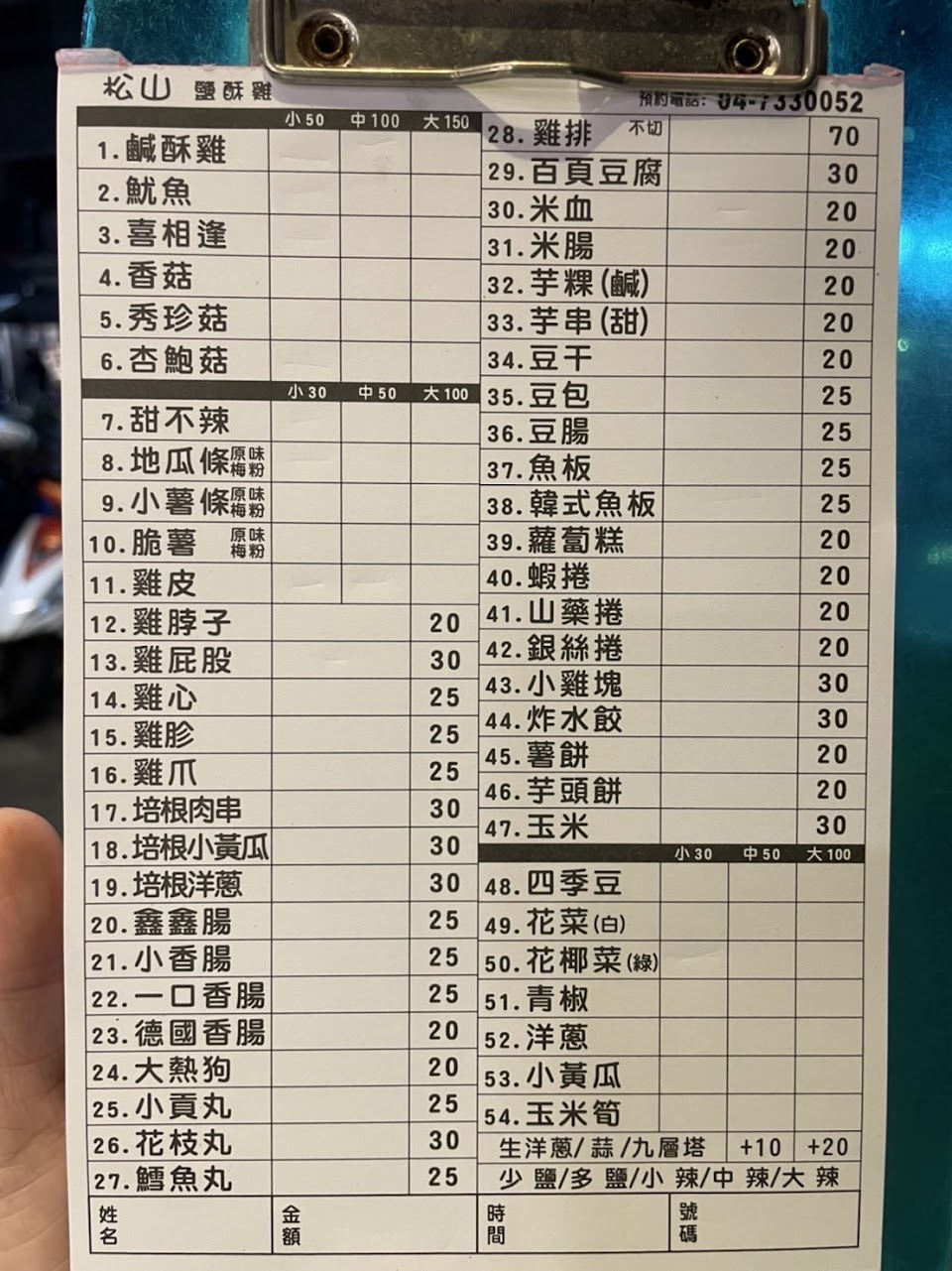 相比一般鹽酥雞,松山的鹽酥雞放涼後,外皮一樣酥脆,炸功真的了得。其餘的炸物,水準也在一般之上。