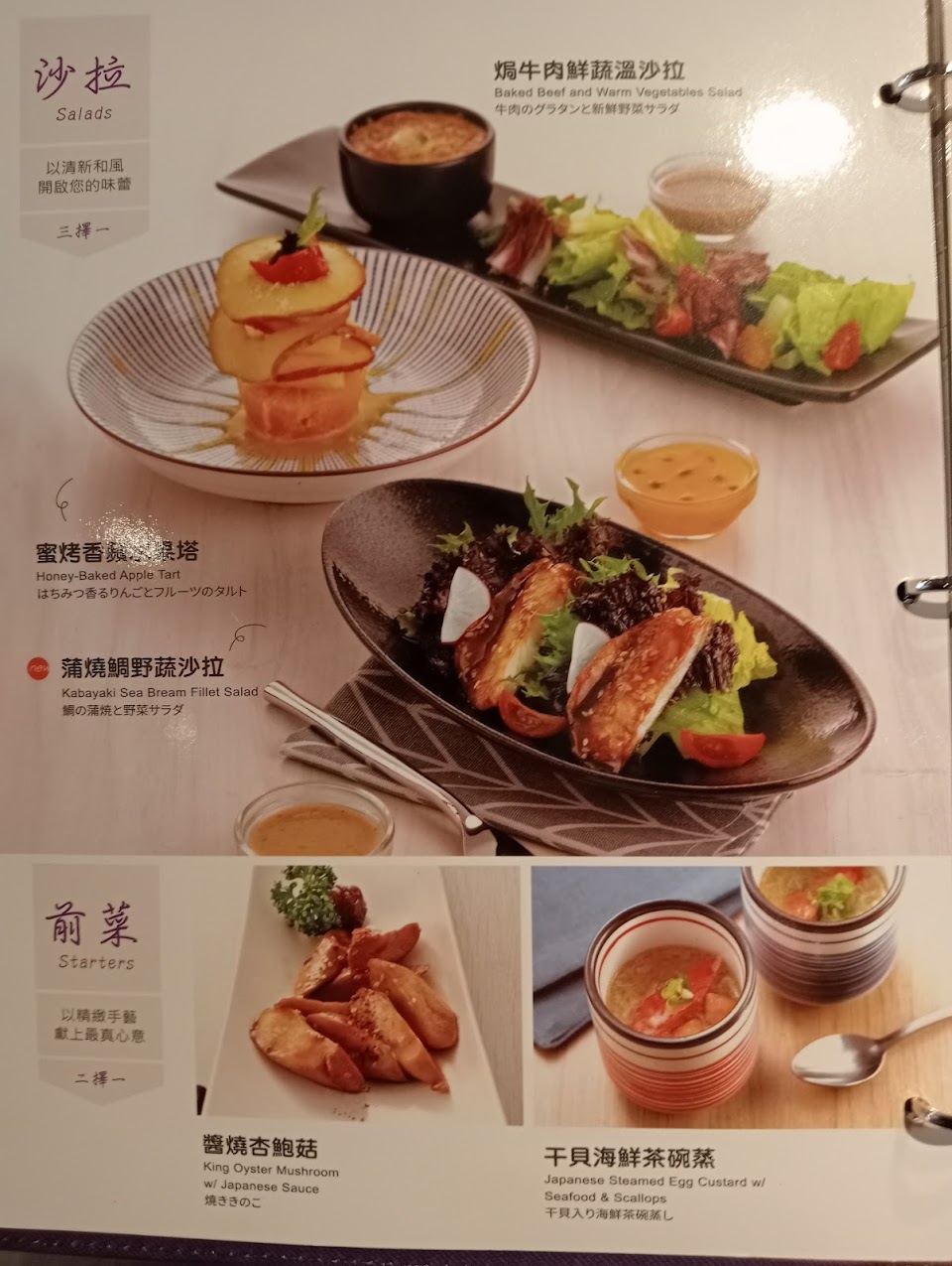 焗牛肉鮮蔬溫沙拉, 干貝海鮮茶碗蒸