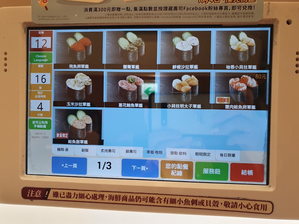 壽司的選擇比另一間迴轉壽司多,口味大部分也都好吃,只是店員好忙,講完需要濕紙巾立刻就忘記了,然後小禮物的中獎機率可以高一點嗎,都吃到一千多元,才中一次…哭。然後每次雖然有事先網路抽號碼牌,然後再去現場抽,但還是等好久,號碼機機制真的要改善,那個已經過號的,還一直重複喊不是浪費時間嗎,鯛魚燒冰淇淋出乎意料好好吃,鯛魚燒皮脆脆的,紅豆甜度剛剛好,冰淇淋也好好吃!!