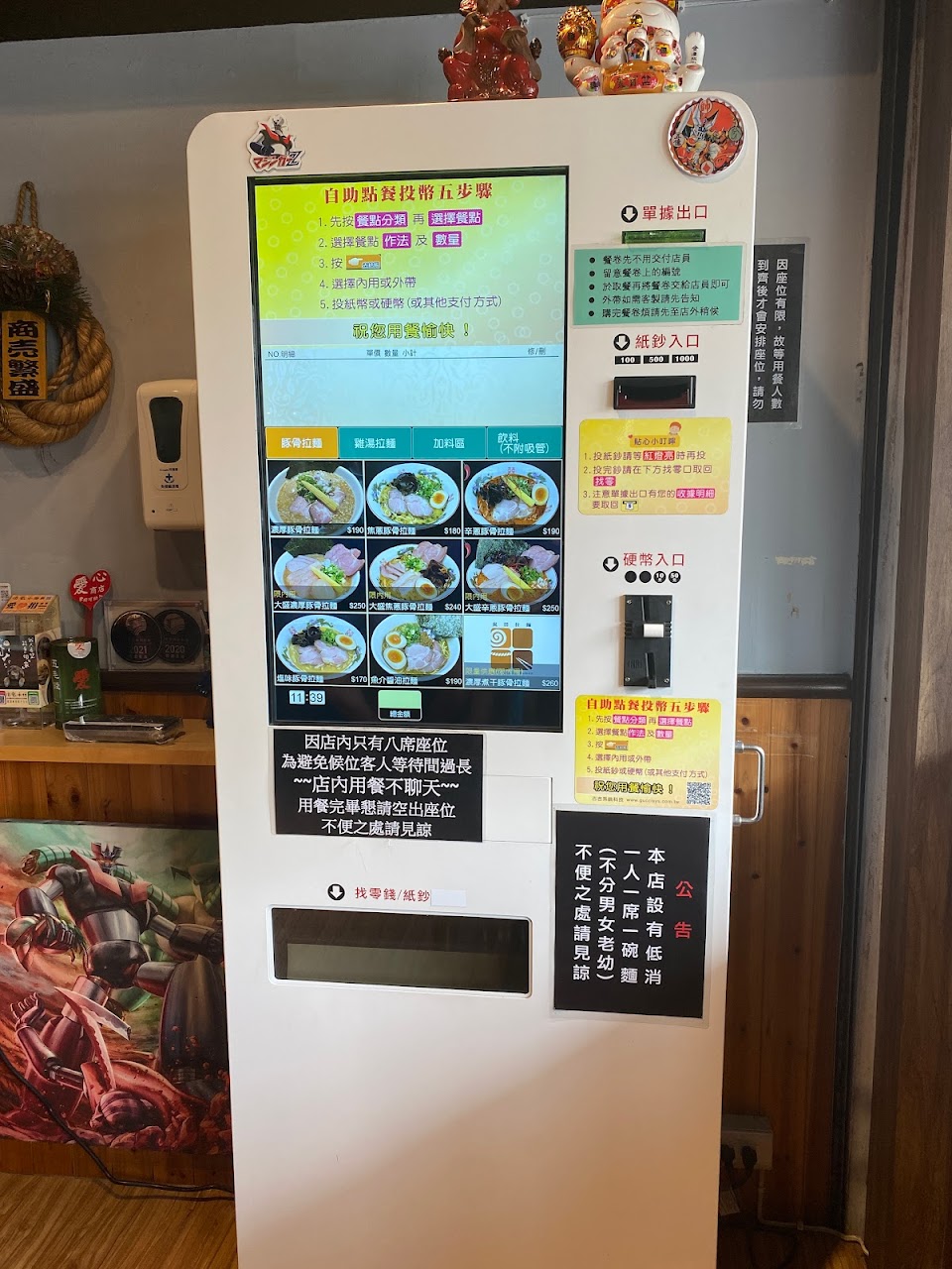 使用自販機點餐,僅收現金(硬幣限10元、50元),依收據上的編號依序叫號入座。