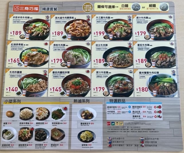三商巧福的餐點,多年以來,口味都沒有變,麵條跟湯頭還有小菜都很美味。門市很多很多間,可是不管是在哪個縣市跟分店或是國道休息區的分店,品質都是一樣的,不知道吃什麼的時候,這是一個不雷的選擇。個人喜歡原汁牛肉麵與清燉牛肉麵,雖然台北市晶華酒店的紅燒牛肉麵也吃過,不過覺得晶華酒店是氣氛很好,裡面販售的紅燒牛肉麵的話,食用完,沒有特別的記憶。三商巧福的牛肉麵可以說是平價又好吃的牛肉麵。還有提供飯類,不過因為牛肉麵就很好吃了,沒有點過飯類的品項。