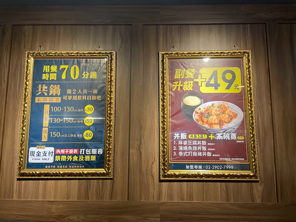 火鍋點法是先點湯底、肉、主食,再看要加點什麼料,或加價49元可有三種特色丼飯。優點是個人鍋也可選兩種湯底,肉盤份量十足且肉質還不錯,另外有飲料吧、霜淇淋機、明治冰淇淋,甚至還有爆米花機供應甜爆米花。