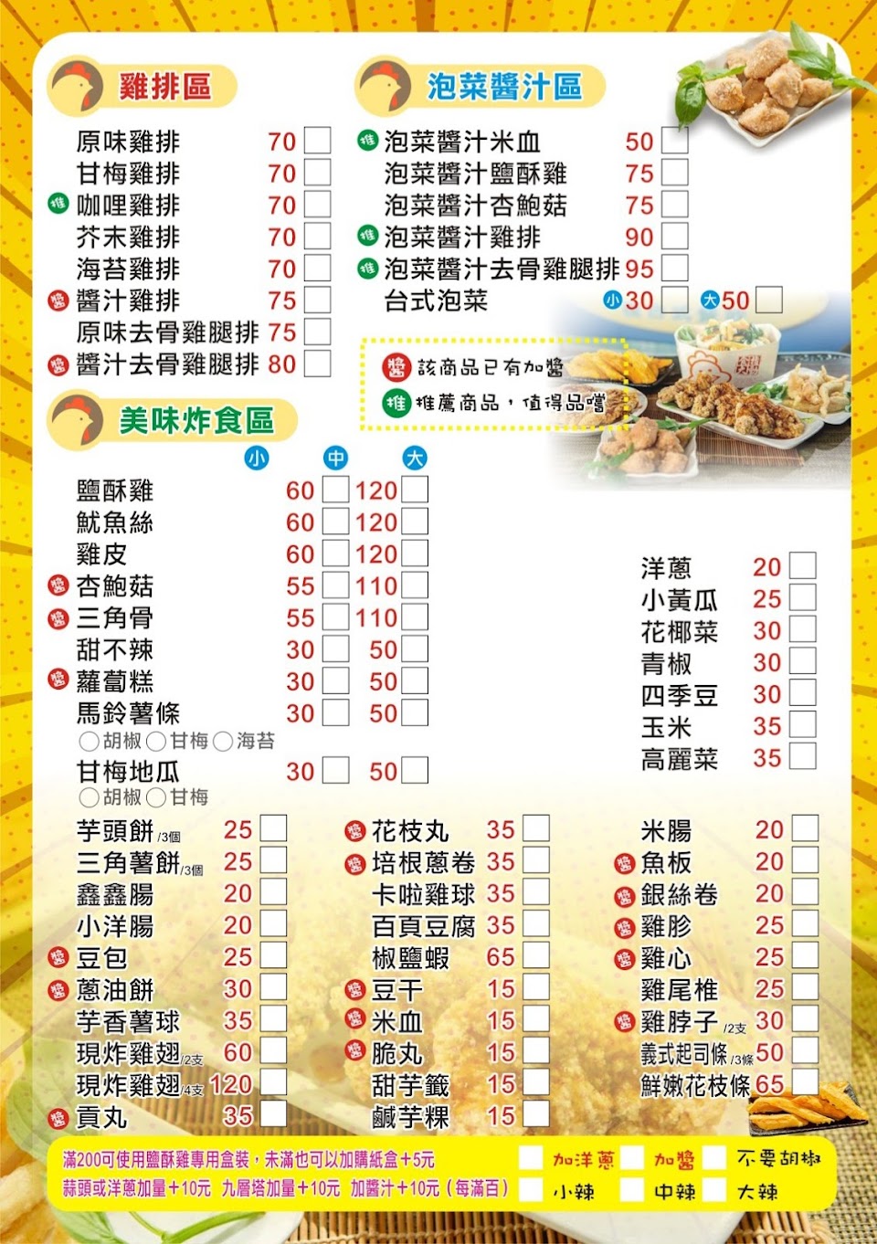 突然變好貴讓宿舍的人措手不及,但醬汁雞排很好吃,有人推甘梅雞排和米血,馬鈴薯條不是一般的薯條可以嘗試,杏鮑菇小貴但很好吃,泡菜醬汁米血偏貴