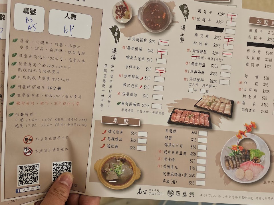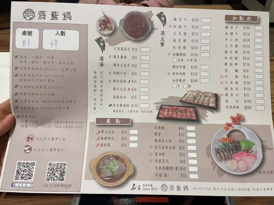 店家很誠實,「限量供應」蛤蜊跟白蝦,真的很限量,蛤蜊排了兩次都沒有拿到,白蝦更是用餐期間從頭到尾都沒有出現過。不過蔬菜部份不錯,龍鬚菜上滿滿的蟲卵,額外幫你補充蛋白質。這家店很熱情,是我們第一次遇到的吃到流汗的火鍋店。用餐結束跟櫃檯反應,櫃檯很敷衍的說下次改進,但是她不知道因為她的態度,這次都處理不好了,我們怎麼還會有未來呢?(不過她也無所謂就是了。)