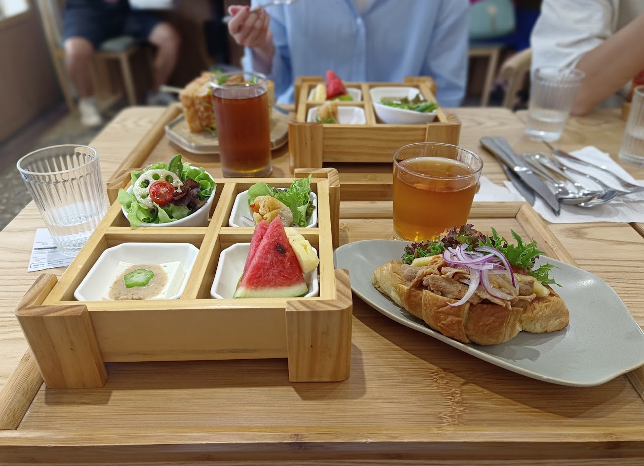 可頌真的非常好吃,外酥內軟的。水耕生菜吃起來很爽脆,國寶茶喝起來也很順口,建議大家來吃飯都升級套餐。