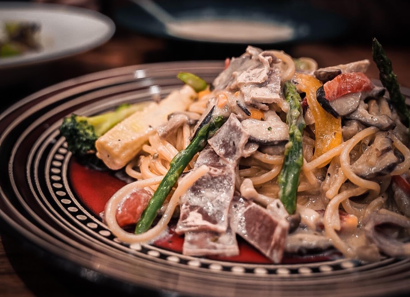 兩人點了辣舌豆腐煲、奶油蕈菇義大利麵和孜然杏鮑菇,很飽,非常好吃。環境舒適,不管您是不是吃素都非常推薦。