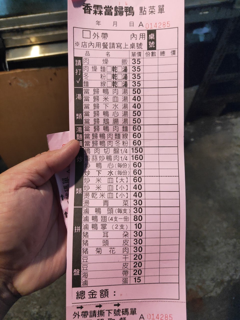 沒有開放內用,桌上自行畫單後撕下號碼牌菜單給老闆,鴨肉麵跟肉燥冬粉滿好吃的,炒米血還不錯,但沒有特別厲害,整體價格算便宜。