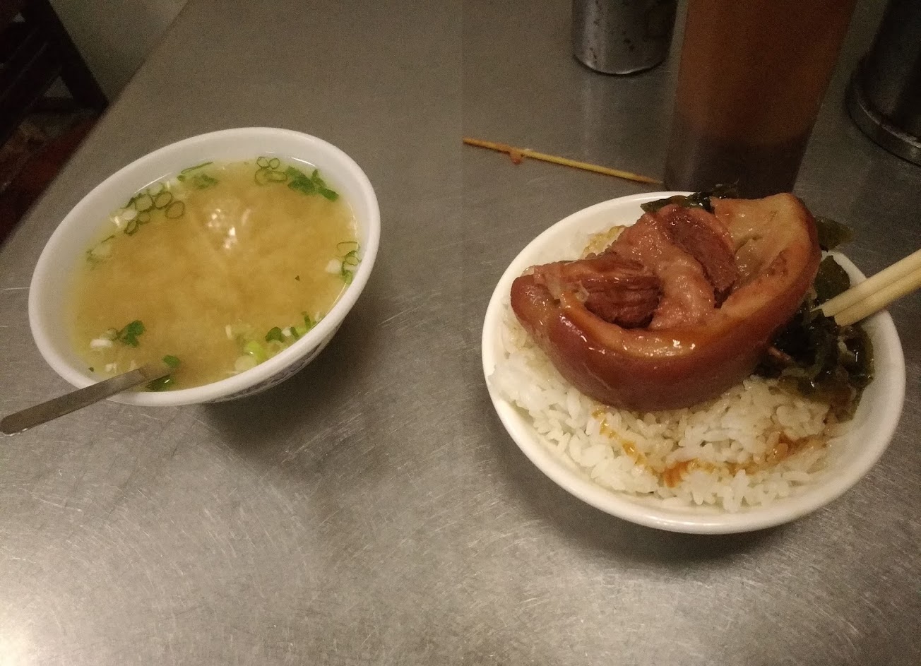 吃不到心中排名第一的爌肉飯,只好來這邊報復性消費。但這家最好吃的不是爌肉,而是圖上的10元味噌湯、10元滷鴨蛋跟豬腳。