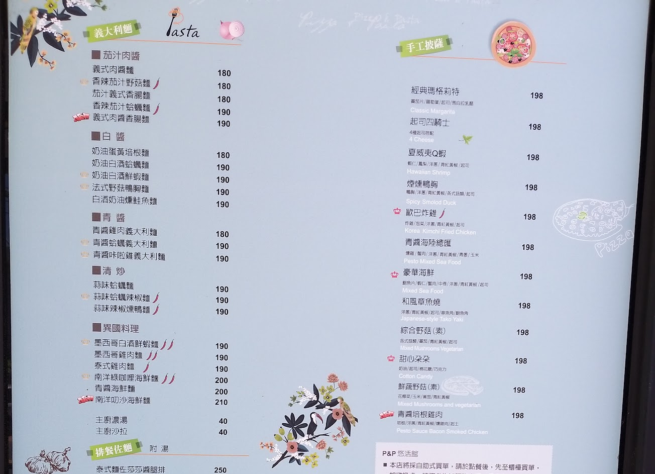 義大利麵是屬於較彈牙的細扁麵,青醬好吃 戰斧豬排很傻眼,很像中式排骨的味道? 火鍋還可以,不算難吃 …