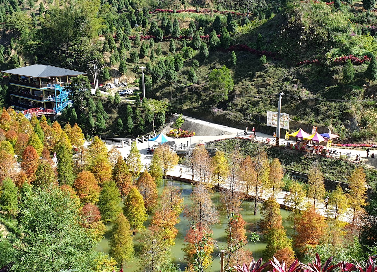 一個非常人工的景點,落雨松是外來種種在山坡上,是否對整個山坡保育有影響,台灣人只知道有黃黃的樹,綠綠的人工湖水可以拍照,但現在散發的就是極為人工假景點的氛圍,連落雨松都是一根一根地排列整齊毫無自然氣息。園區內有販賣部,有一攤是臭豆腐,沿路走在園區上都是臭豆腐味道,整個非常local,園主美意開放參觀,但終淪為一般低素質的旅遊團觀光景點,與苗栗當地原生特色景點毫無關聯。