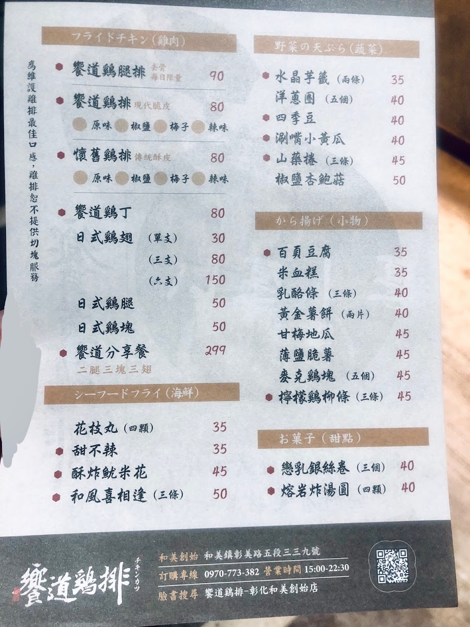 台北來剛好出差經過和美進來饗道雞排買,很多汁美味非常推薦! 餐點:5 服務:5 氣氛:5