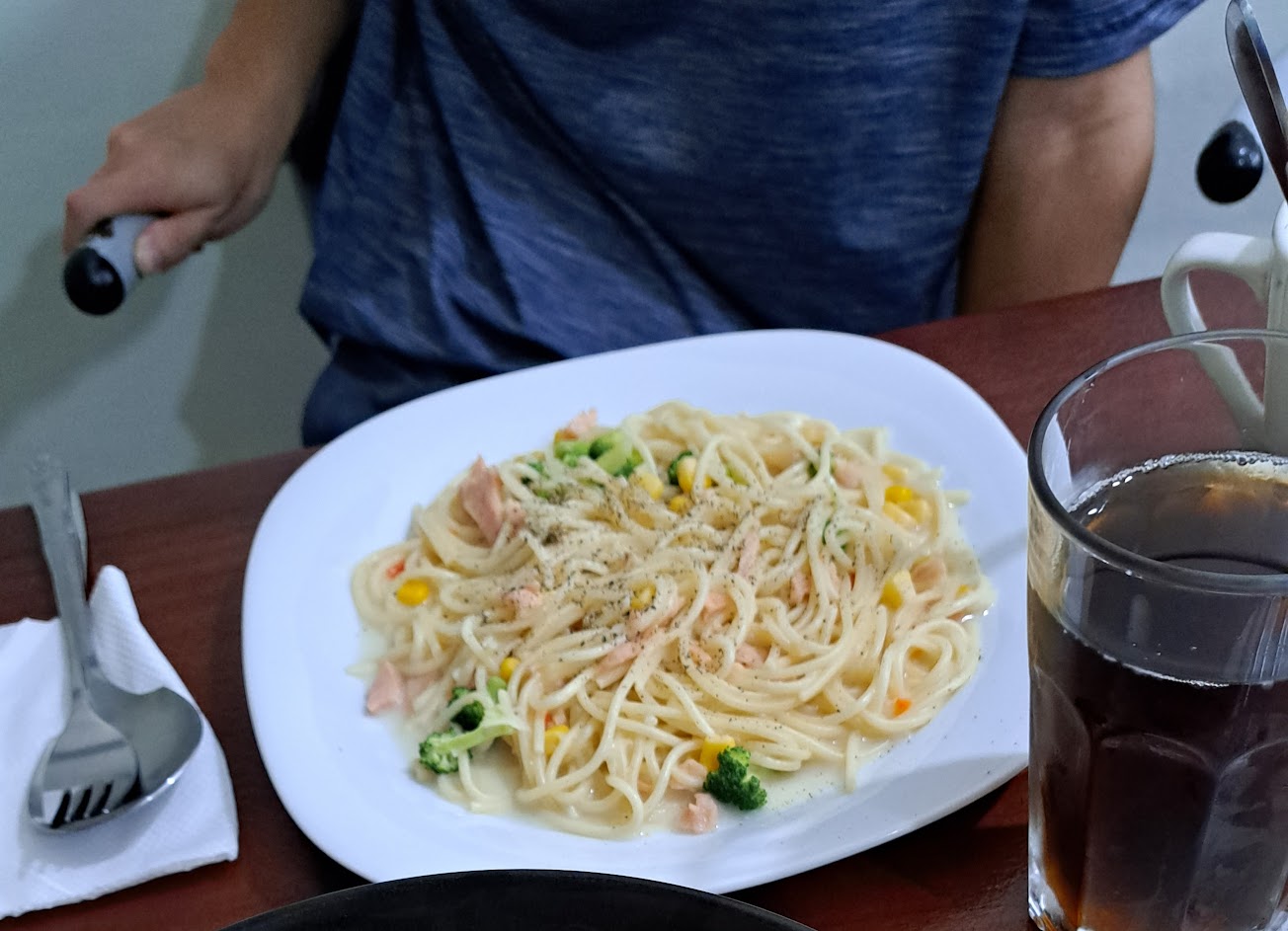炒乾意麵很特別!是我沒有吃過的味道、麵滿多的,好吃!焗烤份量也滿多的還有附紅茶跟濃湯。吃完好飽