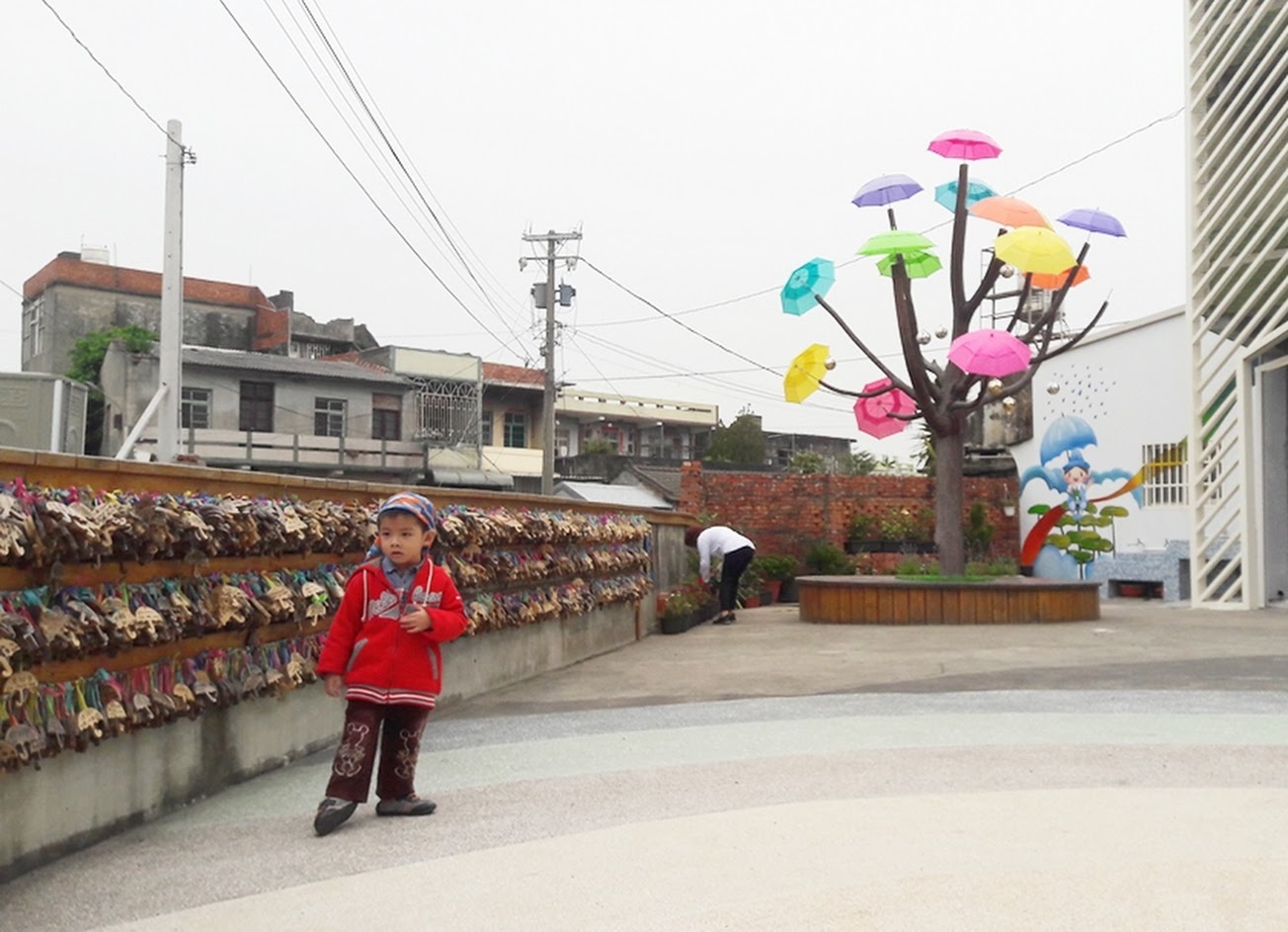彰化越來越多觀光工廠或是這種宣傳小店的裝置藝術,車可以停在北極宮的前面。走路大概三分鐘,沿著彩繪牆走就會走到賣傘的小店,大概花個5-10分鐘就可以拍完照。