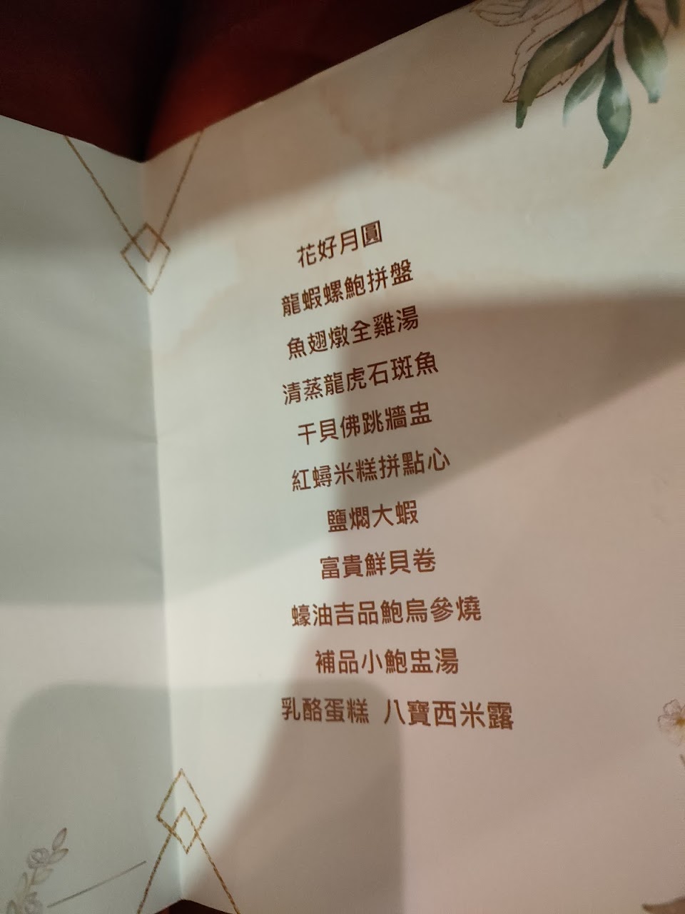 富貴白玉鮮貝卷, 鮑魚沙拉, 清蒸鮮魚, 造型饅頭有內餡, 猴頭菇燉雞湯, 荷葉螃蟹米糕, 鹽焗鮮蝦, 小干貝蔬食, 旭蟹海鮮鍋, 魚翅羹, 餐後 甜點, 蟳肉海皇羹