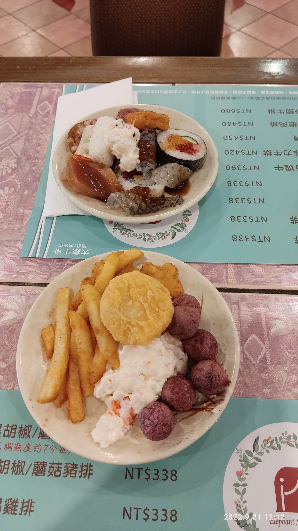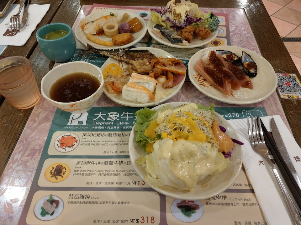 CP值不錯300多塊自助吧選擇蠻多的,前半區自助吧不常更新,可能是要維持品質,後半段5-6道餐點比較常更換菜色,我自己是都各吃一點就好飽了XD,玉米濃湯主觀感覺不錯喝,跟其他家自助吧比起來雖然沒有其他家豐富,但是考量到價格方面個人覺得還OK,(牛排有附1-2口螺旋麵跟一顆蛋)份量雖然不多但畢竟有自助吧看自己想再吃什麼再去拿~記得拿多少吃多少歐~(不要像上次去有別的客人吃太飽跑去廁所吐浪費食物又讓自己不舒服)
