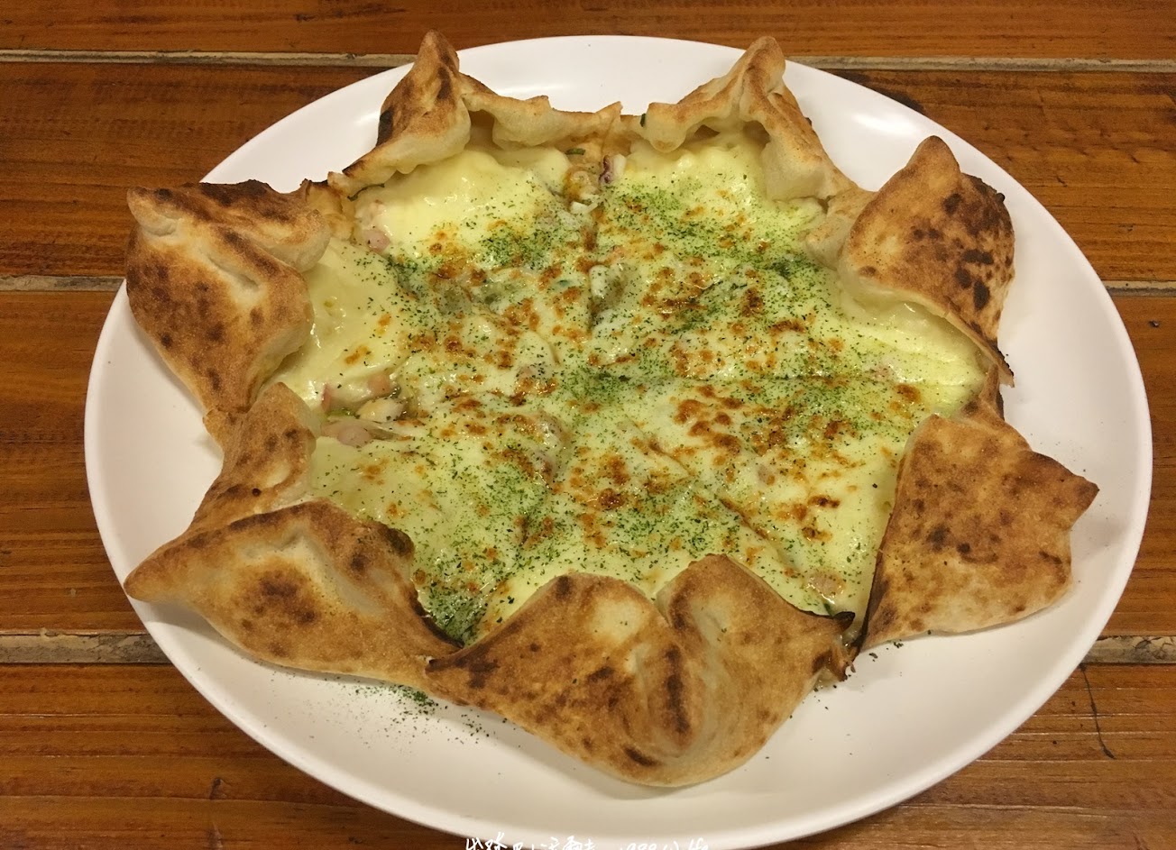 披薩點了章魚燒、芋頭跟招牌肉桂星星糖,章魚燒十分之普通寧願吃拿坡里的。芋頭充滿著滿滿的起司,咬下去香濃的芋泥從嘴裡竄出,好不過癮!可惜前兩個披薩的皮都不夠火候。招牌肉桂星星糖為本次MVP神救援,披薩皮烤的恰到好處外酥內軟,肉桂味並不讓人感到膩口與起司搭配的天衣無縫,必點品項!