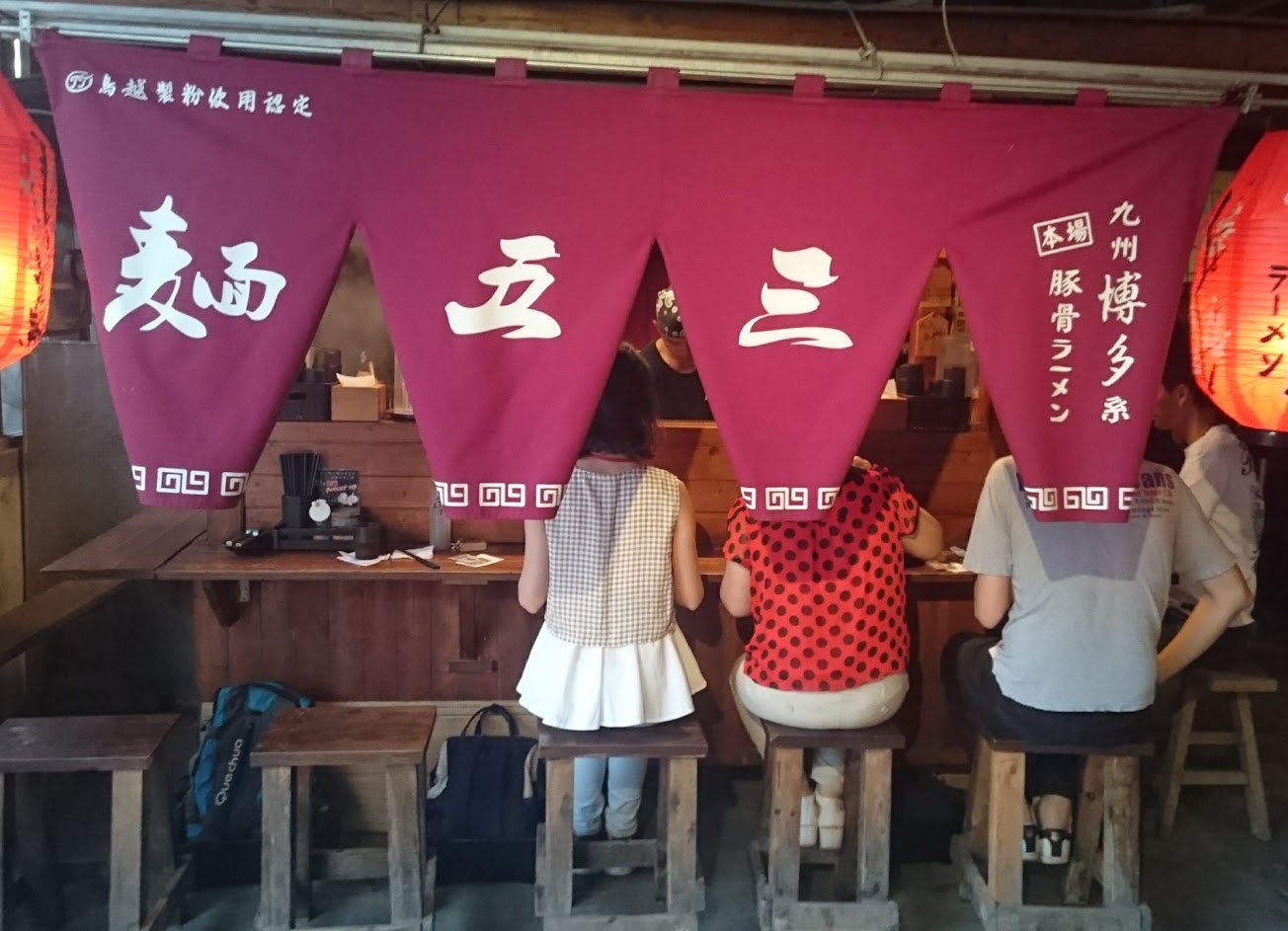 藏身草屯鎮史館路,農田中民宅內的ˋˋ麵五三ˊˊ日本拉麵店。下午四點開始便有絡繹不絕ˋ接踵而至的朝聖客,擠進小農村落大水溝(公館圳)旁的麵屋,下午五點開始排隊點餐發號碼(很多是家庭ˋ朋友邀集用餐,一個號10幾個人,也有整群2–30人的),要等候用到餐平均需3–50分鐘,一眼望去內用餐區,延伸到外面等候的人潮,一小時至少聚集有1—200人,營業至晚上9:00,用餐人潮仍絡繹不絕(晚上8:30點餐,大約還會有50人左右的等待用餐者)。