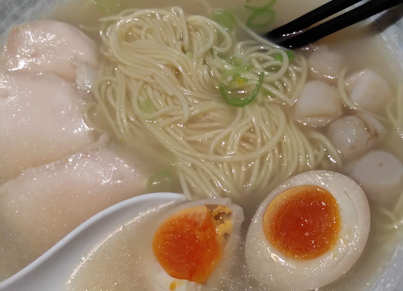 必須很早來排隊,才比較容易有座位。整體餐廳座位數算多,但是慕名而來的客人更多,如果不是第一輪就有位子,就要再等上一段時間。 這次不是吃傳統的味增拉麵,而是點鹽味干貝拉麵,小干貝數量很有誠意,溏心蛋也和網友說的一樣好吃,但是雞肉叉燒(?)感覺普通,肉很鬆軟不扎實,湯頭的部分也較清淡,感覺有點失望。